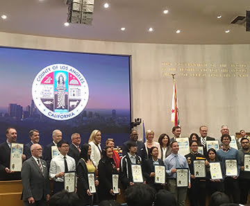 In recognition of the participation of Oak Crest in the Bio-Flex Pre-Apprenticeship Program, we were awarded a scroll signed by the Los Angeles Board of Supervisors. The pre-apprenticeship program is an employer-driven model that aims to create a flexible, yet structured career pathway for the next generation of Bioscience workers in Los Angeles County. The scroll was presented to Dr. Paul Webster (far left in photo). Also present from Oak Crest at the ceremony in the Kenneth Hahn Hall of Administration were Dr. Chris Buser, John Cortez and Simon Webster.